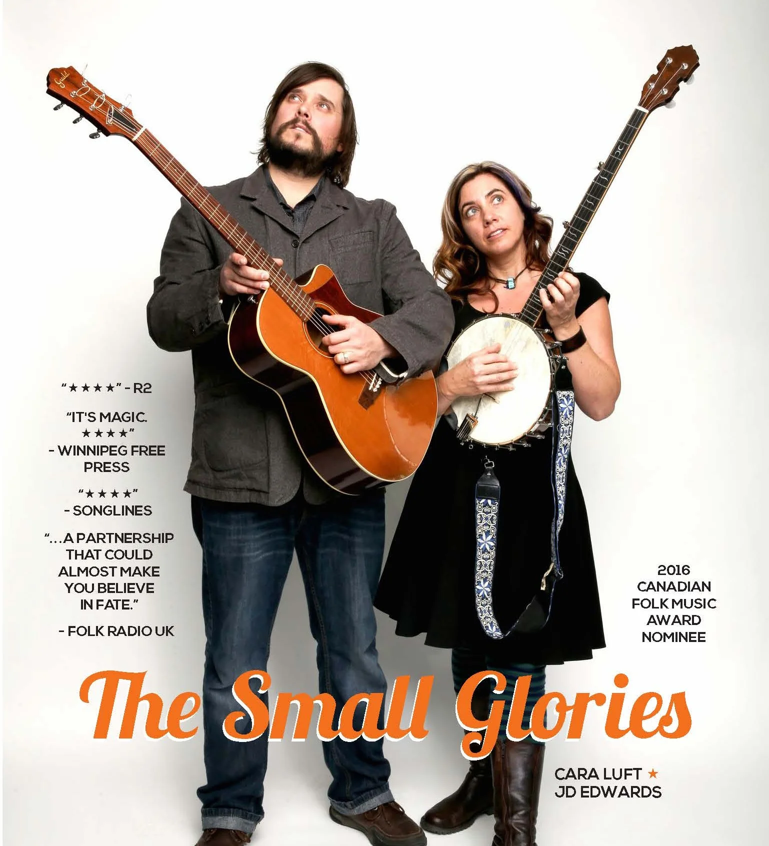 Folk powerhouse pair The Small Glories are Cara Luft & JD Edwards, a dynamic duo planted on the Canadian Prairies. A self-professed “study in contrasts,” Luft's folkie yin proves a perfect match for Edwards’ rocker yang. Thrown together purely by accident for an anniversary show at Winnipeg’s venerable West End Cultural Centre, The Small Glories is a partnership that could almost make you believe in fate.
